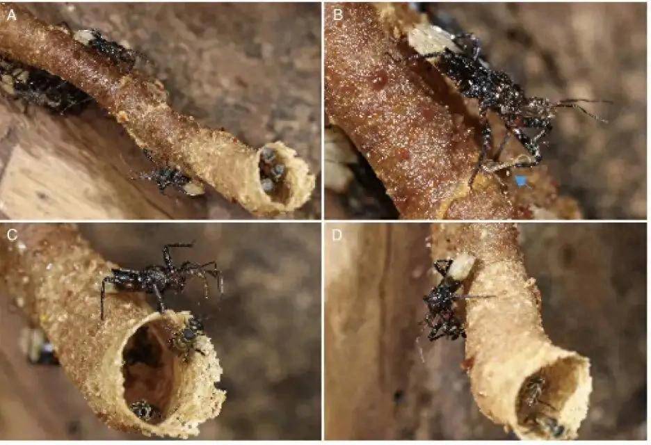 猎蝽在面对这套防御系统之时,展现出令人惊叹的生存策略:猎蝽爬至无刺蜂巢管表面,在发起攻击前用前足蘸取工蜂沉积的树脂(其物理性质类似太妃糖),随后像涂抹护手霜般将树脂均匀涂满前足与中足的股节上。接着,它在巢管入口处抬起涂有树脂的前足严阵以待,待无刺蜂前来攻击时以迅雷之势猛扑,成功捕获后迅速撤离。