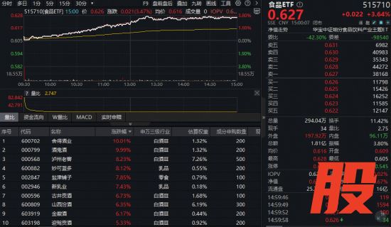吃喝板块今日(11月10日)强势崛起,领涨两市。反映吃喝板块整体走势的食品ETF(515710)早盘持续上行,午后维持高位震荡,截至收盘,场内价格涨3.64%。